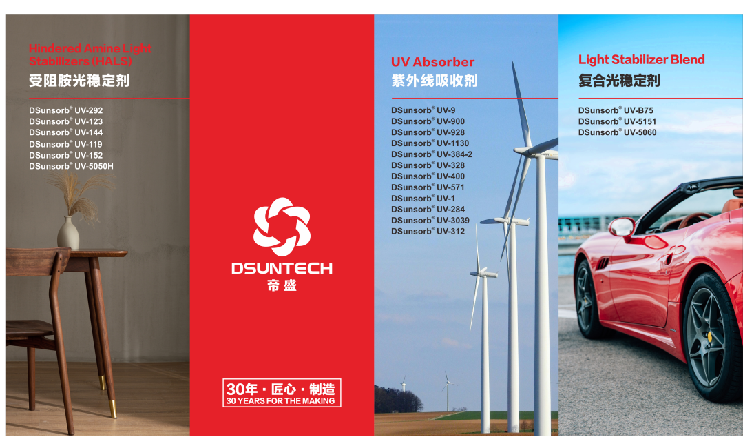 帝盛科技作为紫外线吸收剂和受阻胺光稳定剂领域的重要供应商,不仅提供契合环保与高性能趋势的创新产品,更为涂料行业提供一站式光老化解决方案,助力客户产品持久如新。涂料的应用领域主要分为汽车涂料、工业涂料、木器涂料以及粉末涂料等。针对各领域的特殊需求,帝盛科技推荐了相应的产品,帮助客户进行精准提升品质。作为紫外线吸收剂的专业生产厂家,帝盛科技丰富的品种可以满足客户各类型的需求。